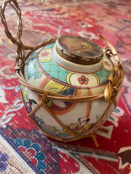 Porslinsburk med handmålat motiv och flätat bärhandtag
