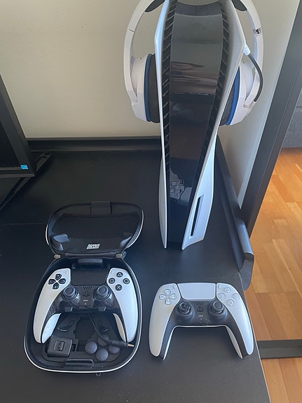 Sony Playstation 5 med DualSense-handkontroller och headset