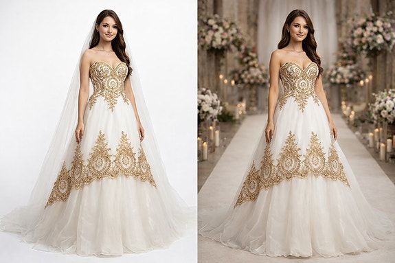 Jean Maclean – exklusiv brudklänning i ivory med guldbroderier + lång slöja
