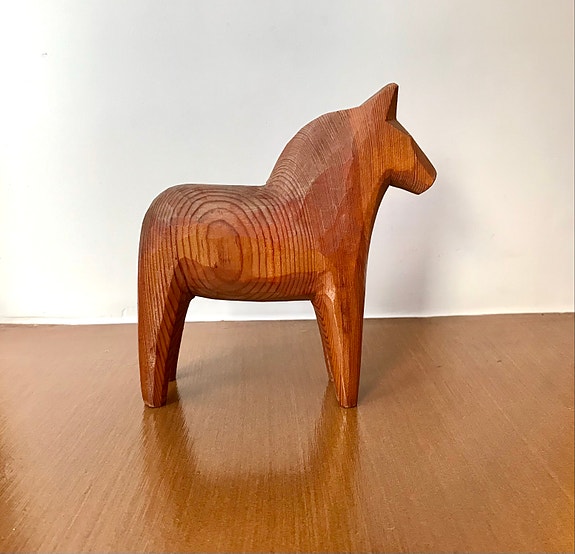 Gammal Dalahäst trären omålad furu allmogestil hantverk samlarobjekt leksak