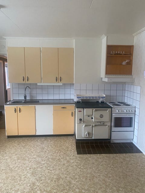 Kök med skåp, spis och kylskåp.