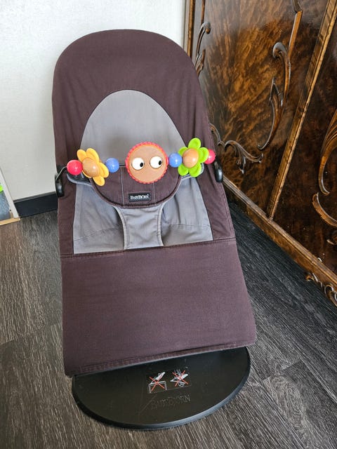 Babysitter Babybjörn med leksak, klädsel i svart och mörkgrått