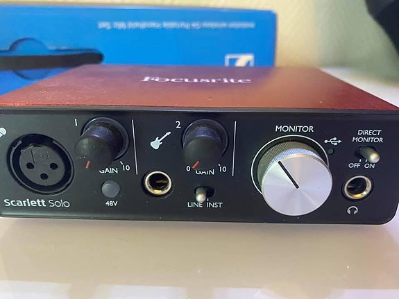 Förstärkare, audiobox, mikrofon med stativ. Finns i centrala Vaxholm.