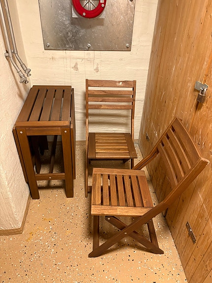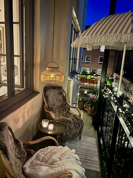 Utomhusmöbler, bord, 2 stolar, parasoll, parasollfot