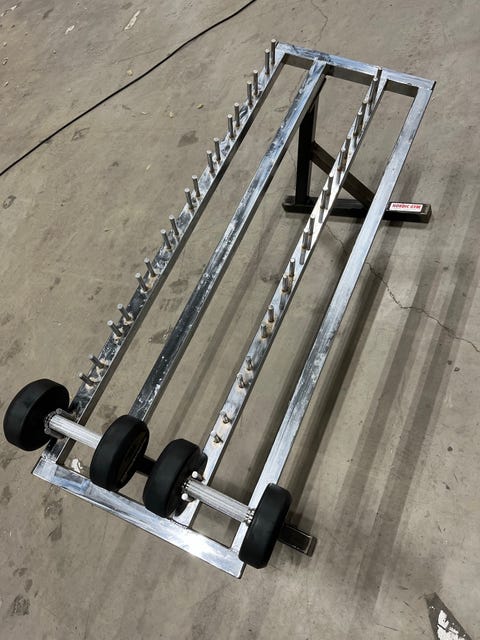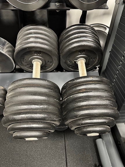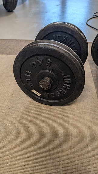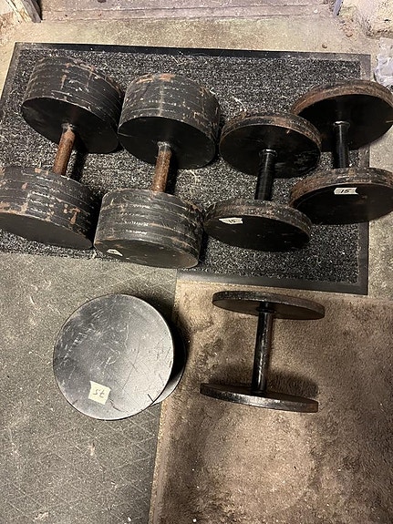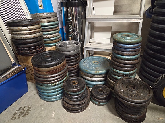 Skivstänger och hantlar.