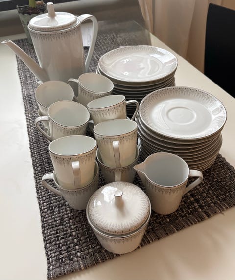 Bing & Grøndahl “Elegance” – stor vit servis med guldbård & skulpterade handtag