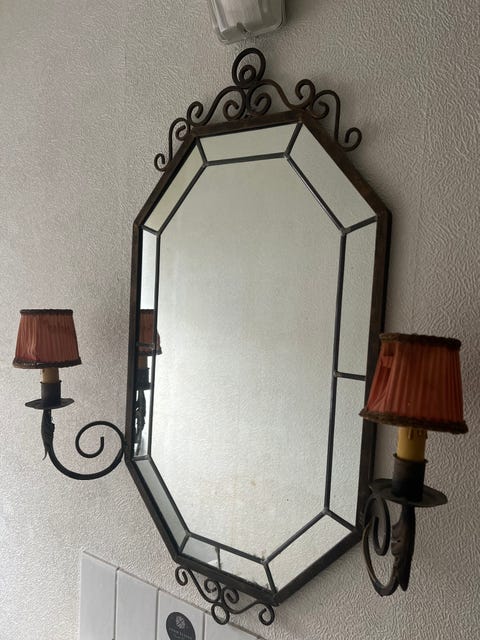 1 570 krUnik Väggspegel med järnram samt detaljer i smide och två lampetter i smideSegeltorp29 janLägg till i favoriter.