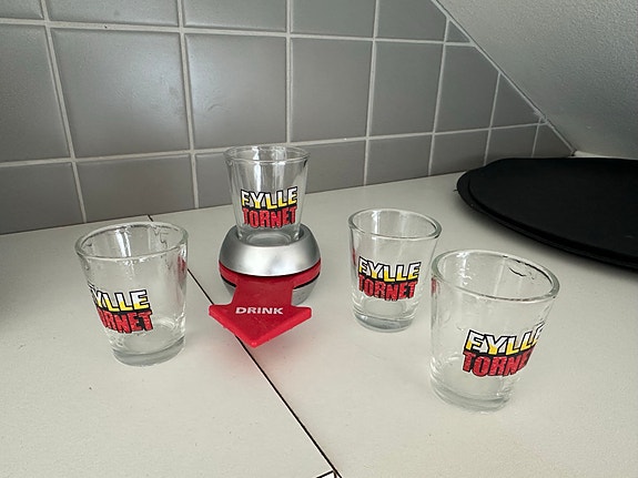 Fylletornet drickspel med fyra shotglas i glas