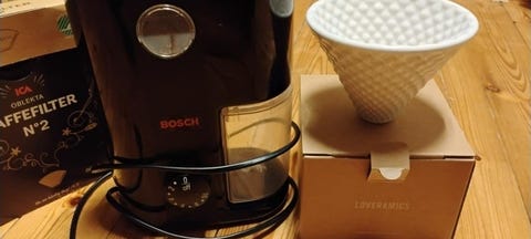 En vanlig kaffemaskin, bryggare eller en mer avancerad espressomaskin kan hittas billigare begagnad