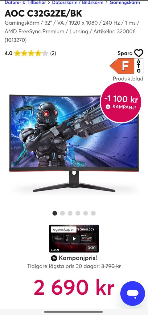 1 300 kr32" FHD-skärm med 240Hz, 1ms och FreeSync Premium i originalförpackningFurulund5 dagarKöp nuBetald placeringLägg till i favoriter.