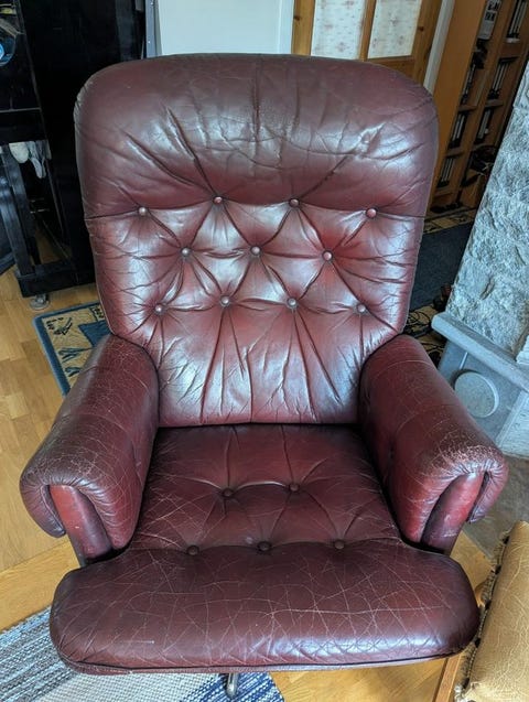 Skinnfåtölj, retro, 2st, bortskänkes!!