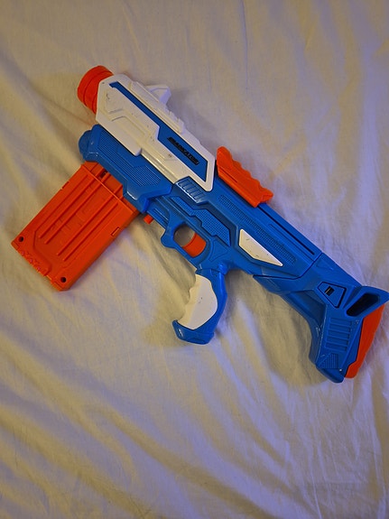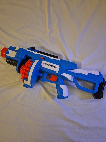Powermech leksakspistol blå och vit liknar Nerf
