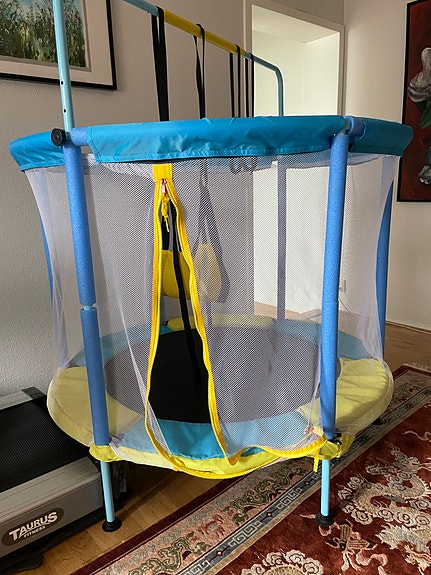 Trampolin för barn med skyddsnät och gungstol blå gul