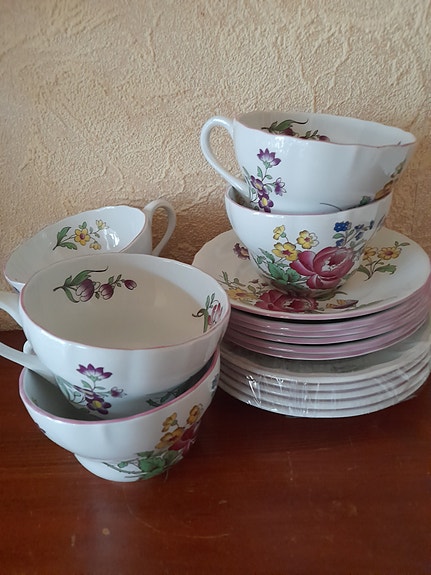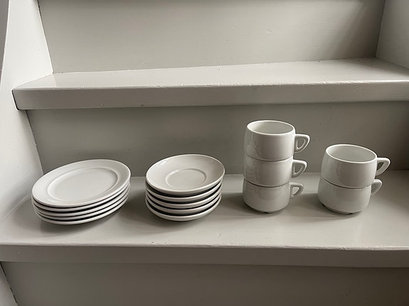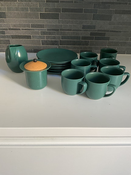 Höganäs the servis 6 koppar, sockerskål med trälock , mjölkanna samt assietter