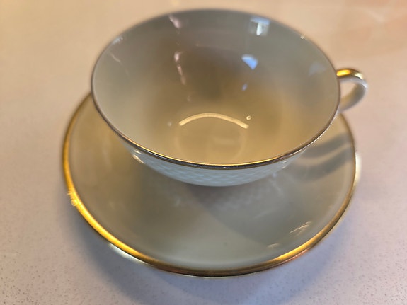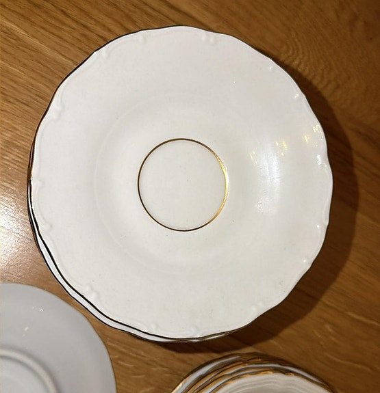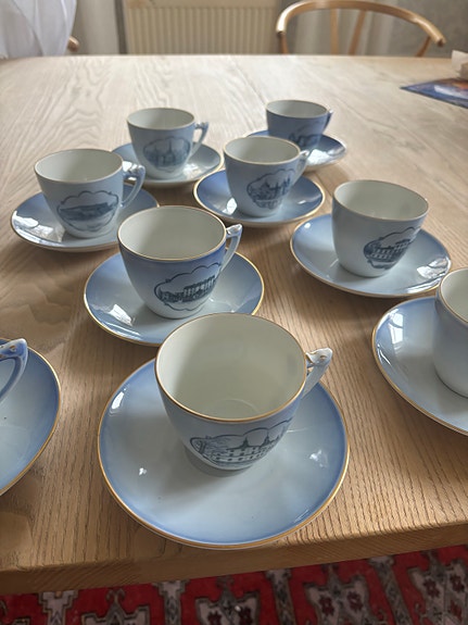 Porslinservis med koppar och fat vit blå med guldkant