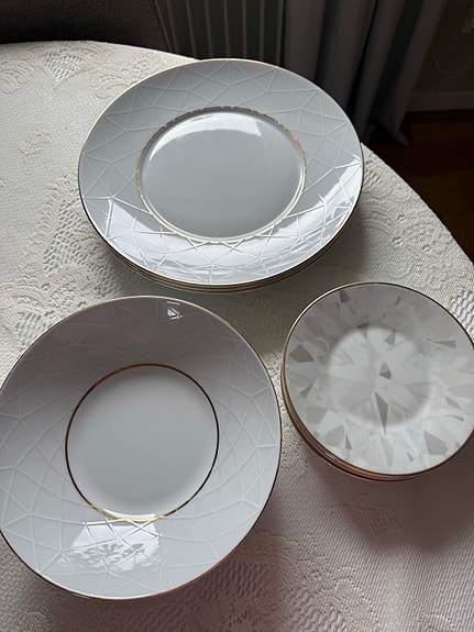 100 krFyrklövern Diamond porslinstallrikar vit med reliefmönster och guldkant FyrklövernGävle19 marLägg till i favoriter.Öppna annons