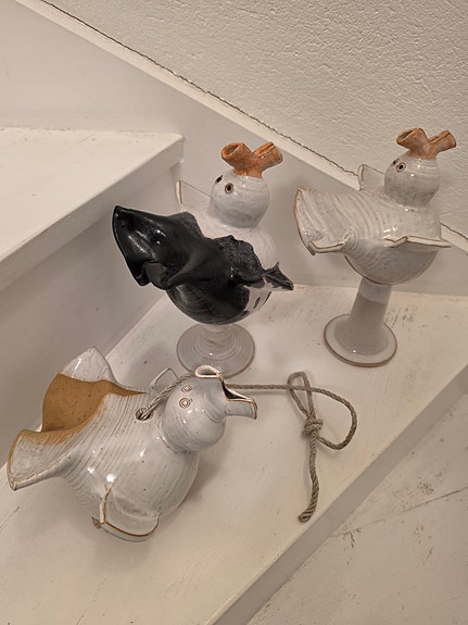 Två stående fåglar och en hängande i keramik