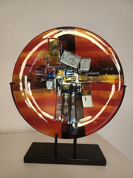 Okänd konstnär dekorativt glasfat på ställning rött flerfärgat