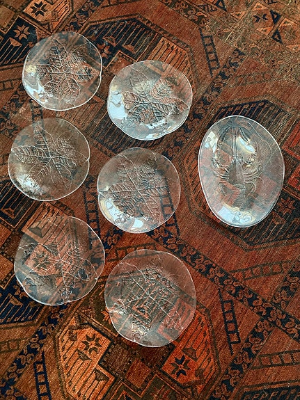 Kosta Boda glasfat med lövmönster och ett Kräftfat