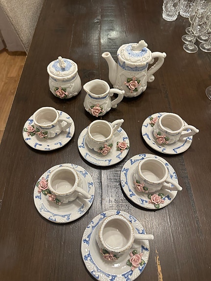 Porslin teservis med blommönster vit blå rosa
