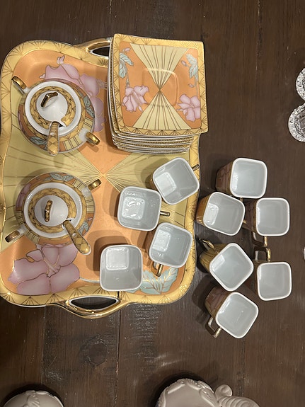 Kaffeservis porslin fyrkantiga koppar och fat med kanna och sockerskål