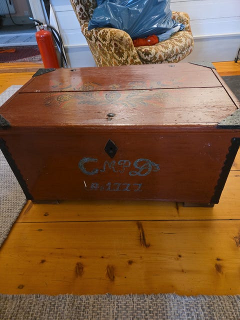 Antik kista i trä med målade dekorationer och förvaringsfack