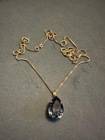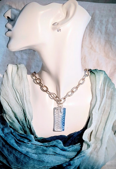Extra fint arbetad stålkedja med glashänge i blåa nyanser
