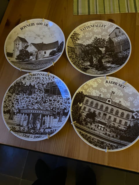 Porslinstallrikar med motiv av svenska byggnader brunvit
