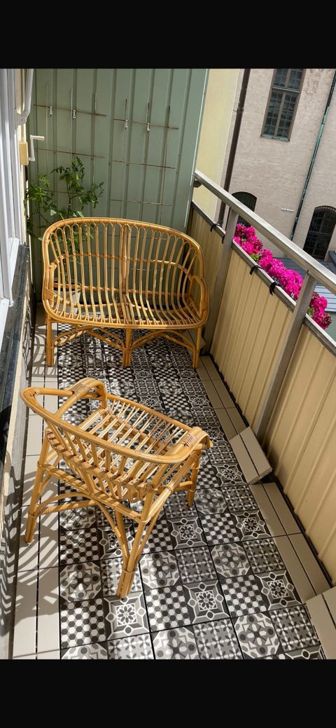 1 000 krUtemöbelset med två fåtöljer och bord i rotting med glasskivaStockholm28.11.25Lägg till i favoriter.