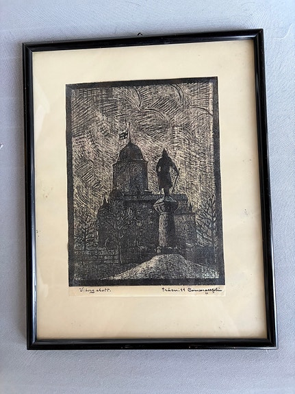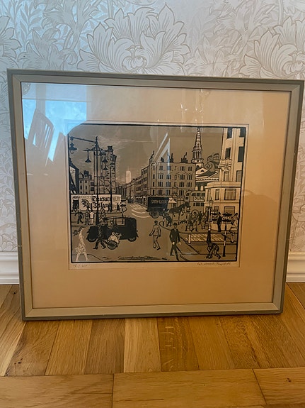 Så här görs ett träsnitt: först skärs ett motiv i en träplatta och därefter appliceras färger på plattan. Papper läggs ovanpå och gnids sedan på baksidan vilket resulterar i att bilden överförs från de utskurna delarna av träet. Om du säljer ett träsnitt på Blocket är det bra att ange dess ursprung och tillverkningsår i annonsen – det är information som många köpare tycker är intressant.