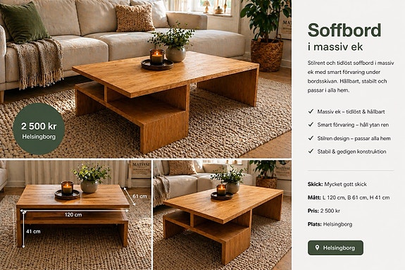 2 500 krSnyggt soffbord i massiv ek Design House StockholmHelsingborg1 timKöp nuLastbil i rörelseKan skickasLägg till i favoriter.Öppna annons