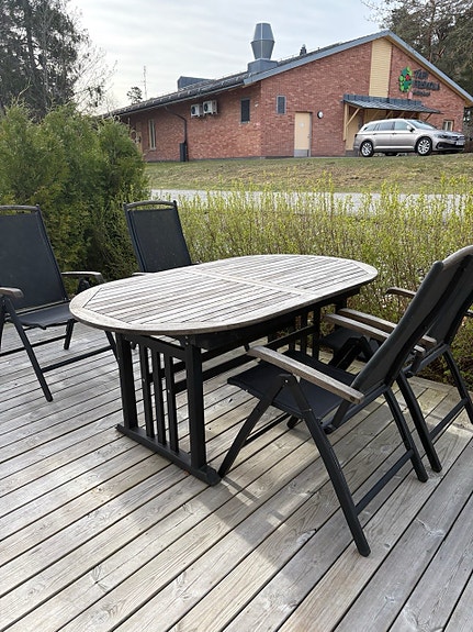 2 200 krMatgrupp utomhus bord i trä med 4 stolar i konstrottingLjungby2 dagarLägg till i favoriter.Öppna annons