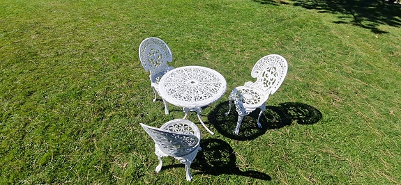 4 200 krGjuten aluminium Cafégrupp bord och 4 stolar vit metallLund2 dagarLägg till i favoriter.Öppna annons
