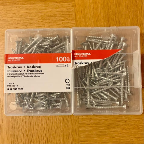 50 krNY träskruv Biltema 5x40 mm 170 st för utomhusbrukLinköping2 dagarKöp nuLastbil i rörelseKan skickasLägg till i favoriter.