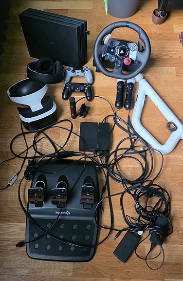 Sony Playstation 4 Pro spelkonsol med handkontroller och racerratt Logitech G29
