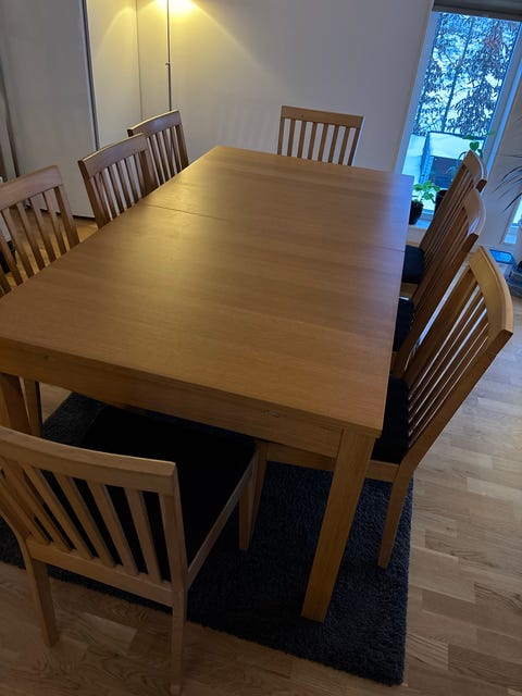 8 500 krMio Woodenforge matgrupp 140–180 cm + 4 originalstolar – iläggsskiva MioStockholm4 dagarLägg till i favoriter.