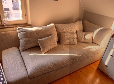 Beige tygsoffa med kuddar