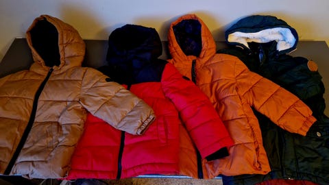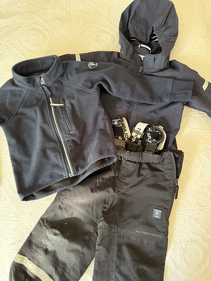 Under vintern är det viktigt att hålla de små varma med rätt kläder: ulliga heldräkter, sockor, vantar, mössor och ytterkläder. En overall är ofta snabbare att ta på än separata jackor och byxor, och snön har svårare att tränga in. I annonserna bör du kolla skicket på ytterkläderna, till exempel hur bra muddar och ben kan justeras, om det finns många reflexer och om kläderna är vattentäta.