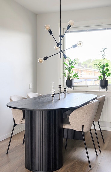 Matgrupp med bord, stolar och taklampa i bok.