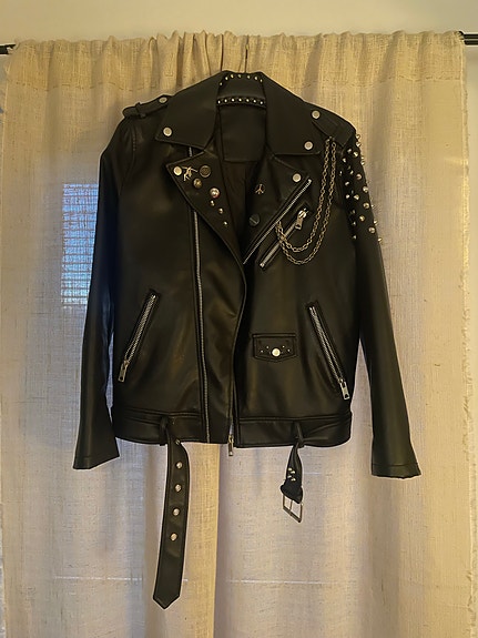 Blingad mc-jacka i fejkläder med matchande vinylgalge