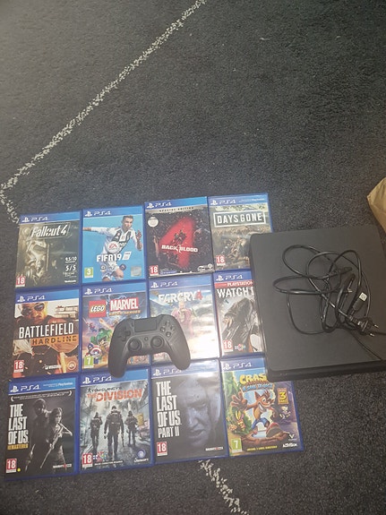 PS4 Slim 1TB + 2 handkontroller + 4 spel