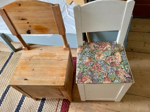 Fyra st. antika trästolar med mönstrade tygklädda sitsar