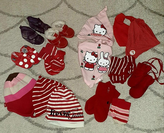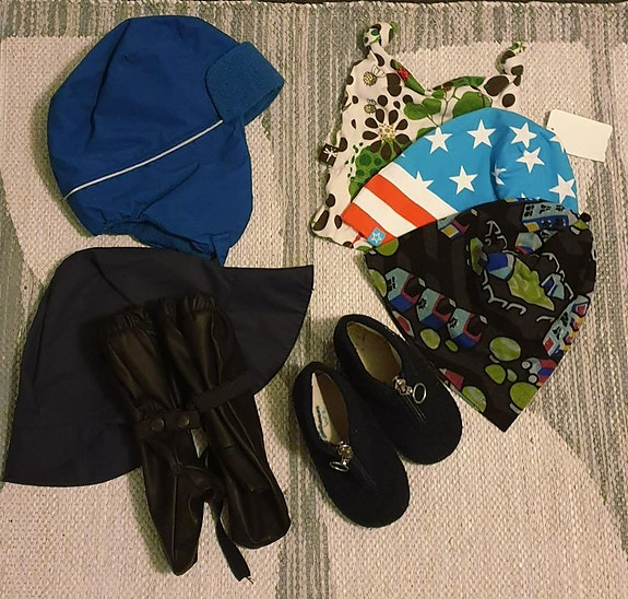 litet paket med mössor vantar o tofflor i ull pop 1-3 år