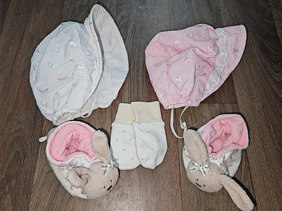 Innetofflor (Skallra på kaniner) + tumvantar + 2st vintage solhatt
