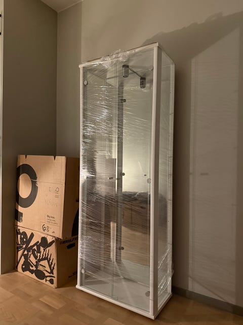 Hyllor med glasluckor.