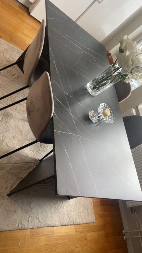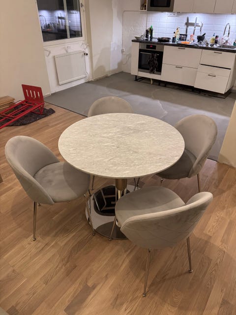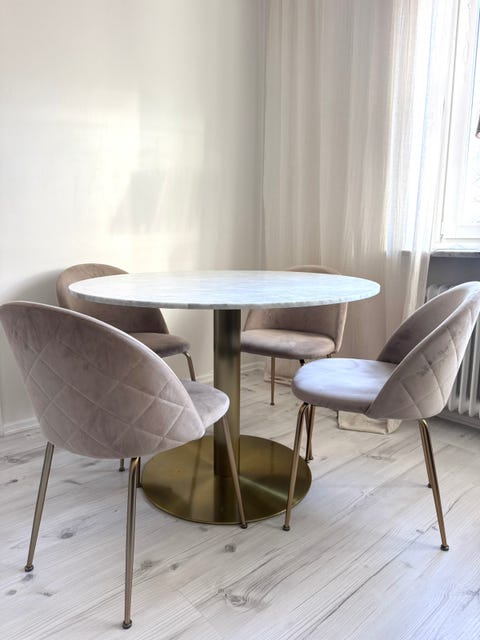 7 000 krStephanie matgrupp Ø106 – marmormönstrat glas & mässing – 4 Sharon karmstolar MioSolna7 febLägg till i favoriter.