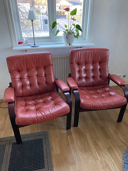 2 skinnfåtöljer med fotpall