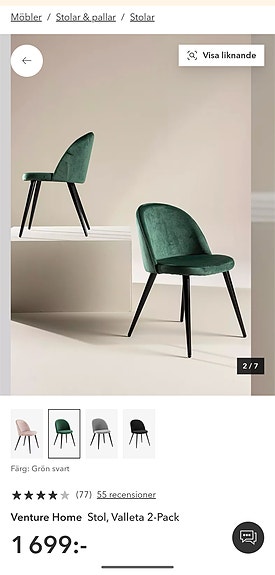 1 200 krVenture Home stol 6st - grön sammet med svarta ben Venture HomeMalmö6 aprLägg till i favoriter.Öppna annons