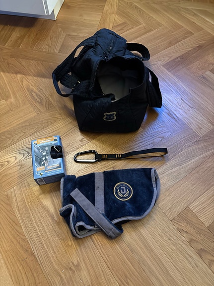 Hundväska med bilsele och hundtäcke liten hund svart blå