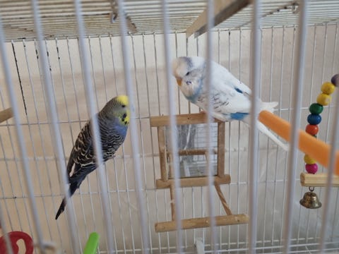 Två undulater med bur
